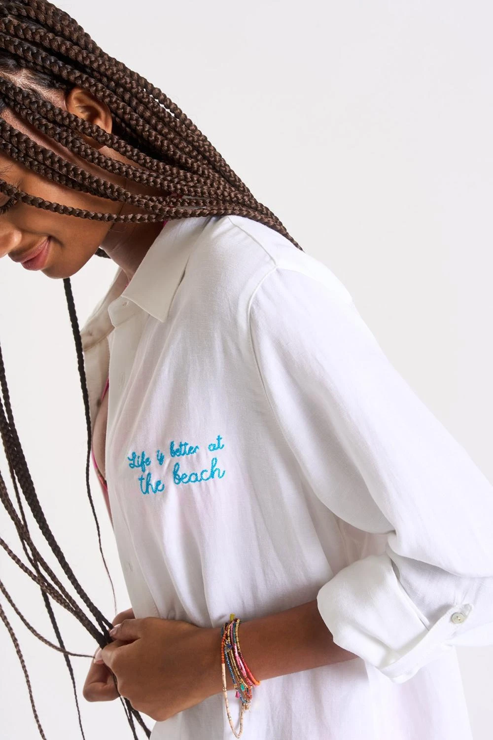 Cette robe chemise 100% coton vous assurera confort et simplicité. Elle peut se porter ouverte avec un bikini ou fermée pour la ville. Elle comporte une inscription brodée « Life is better at the beach » sur le devant !