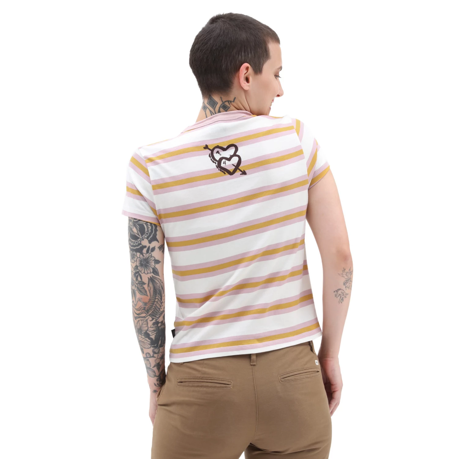 Le t-shirt Karina Rozunko de Vans présente un col ras du cou, des manches courtes et un motif rayé sur l’ensemble. Deux cœurs ornent également le dos.